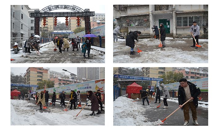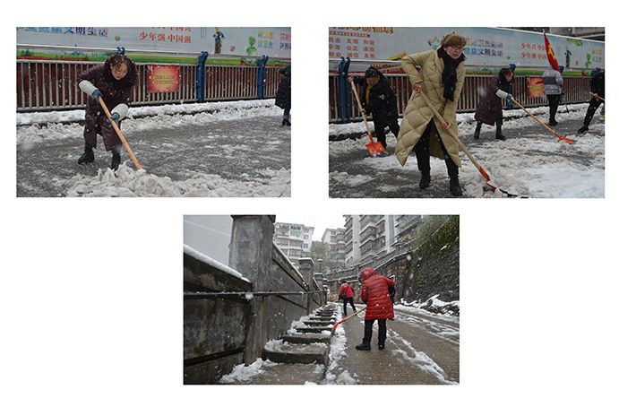各攻堅(jiān)隊(duì)帶領(lǐng)隊(duì)員手拿鐵鍬竹帚提示牌,分組前往蘋(píng)果山花園1-3號(hào)樓、州建社區(qū)、文化南路道路兩側(cè)、石階步道等處,沿著道路對(duì)沉墊在人行道上的厚厚積雪進(jìn)行清除,此次積雪遠(yuǎn)比前兩次厚重許多。志愿者們迎著大雪紛飛,用熱情行動(dòng)融化持續(xù)飄落在臉頰上的雪花,清掃出1公多里長(zhǎng)3米寬的社區(qū)道路和沿街步道,保障了市民群眾和社區(qū)居民安全暢行。