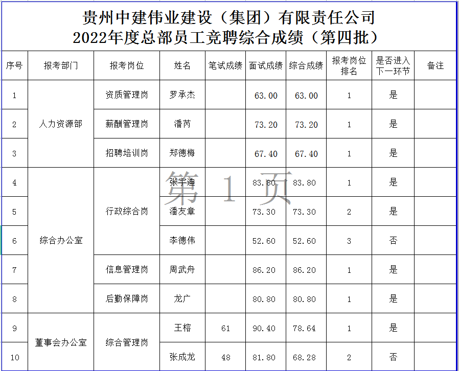 根據(jù)《貴州中建偉業(yè)建設(shè)(集團(tuán))有限責(zé)任公司總部員工競聘方案(第四批)》規(guī)定,經(jīng)報名、資格審查、面試等程序,現(xiàn)將綜合成績予以公示。