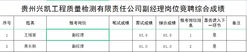 貴州興凱工程質(zhì)量檢測(cè)有限責(zé)任公司2022副經(jīng)理崗位競(jìng)聘綜合成績(jī)名單公示