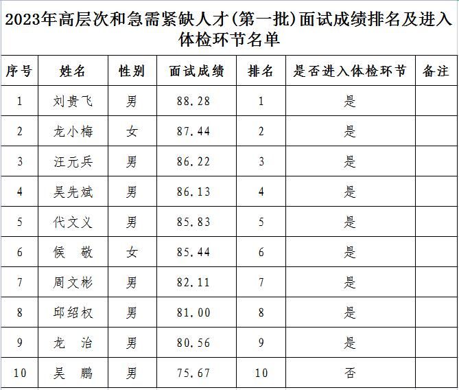 附件:2023年高層次和急需緊缺人才(第一批)面試成績排名及進入體檢環(huán)節(jié)名單